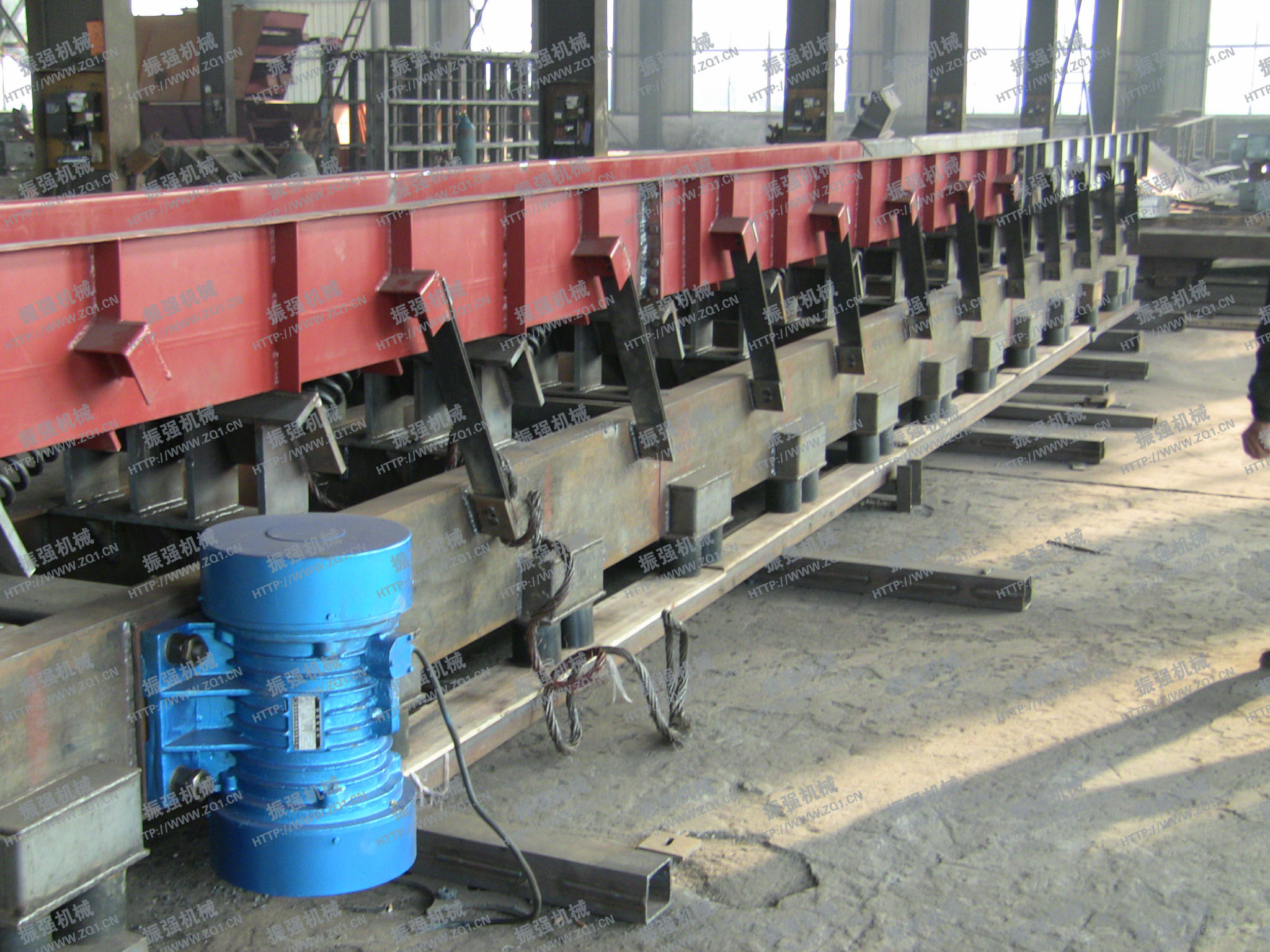 振動(dòng)輸送機(jī)主要由承載構(gòu)件、彈性元件及激振器等組成。振動(dòng)輸送機(jī)是利用激振器使料槽振動(dòng),從而使槽內(nèi)物料沿一定方向滑行或拋移的連續(xù)輸送機(jī)械。
